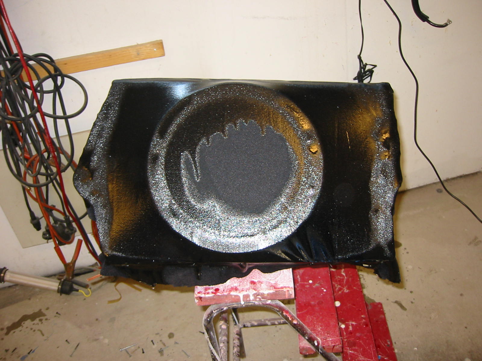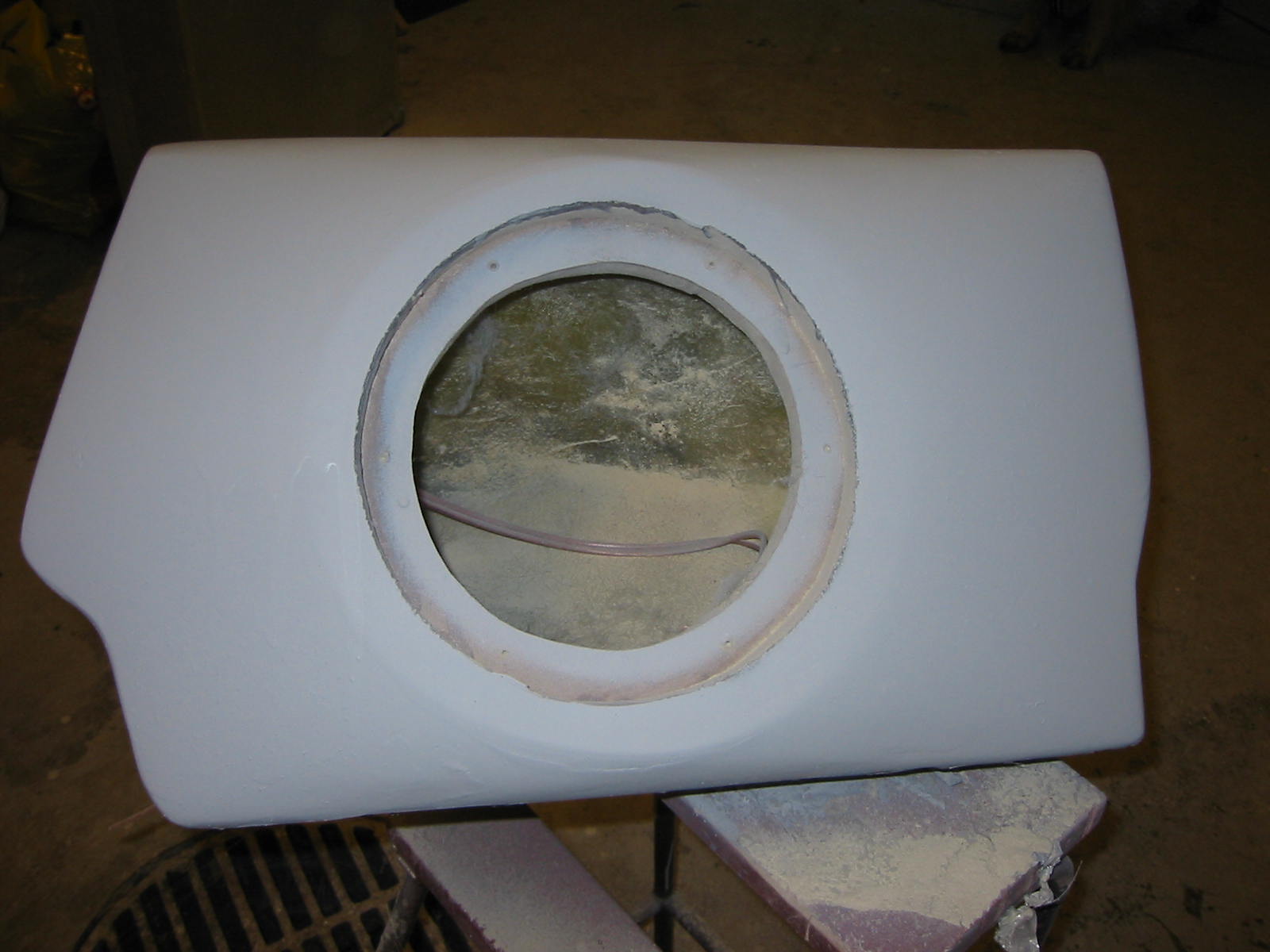 Siitä se alkoi... Ensiksi muotti jalkotilaan, viikko laminointia, seinämävahvuus noin 25mm, hartsia 10kg ja mattoa... riittävästi... sitten etulevyn sovittelu paikoilleen, elementin upotuskauluksineen