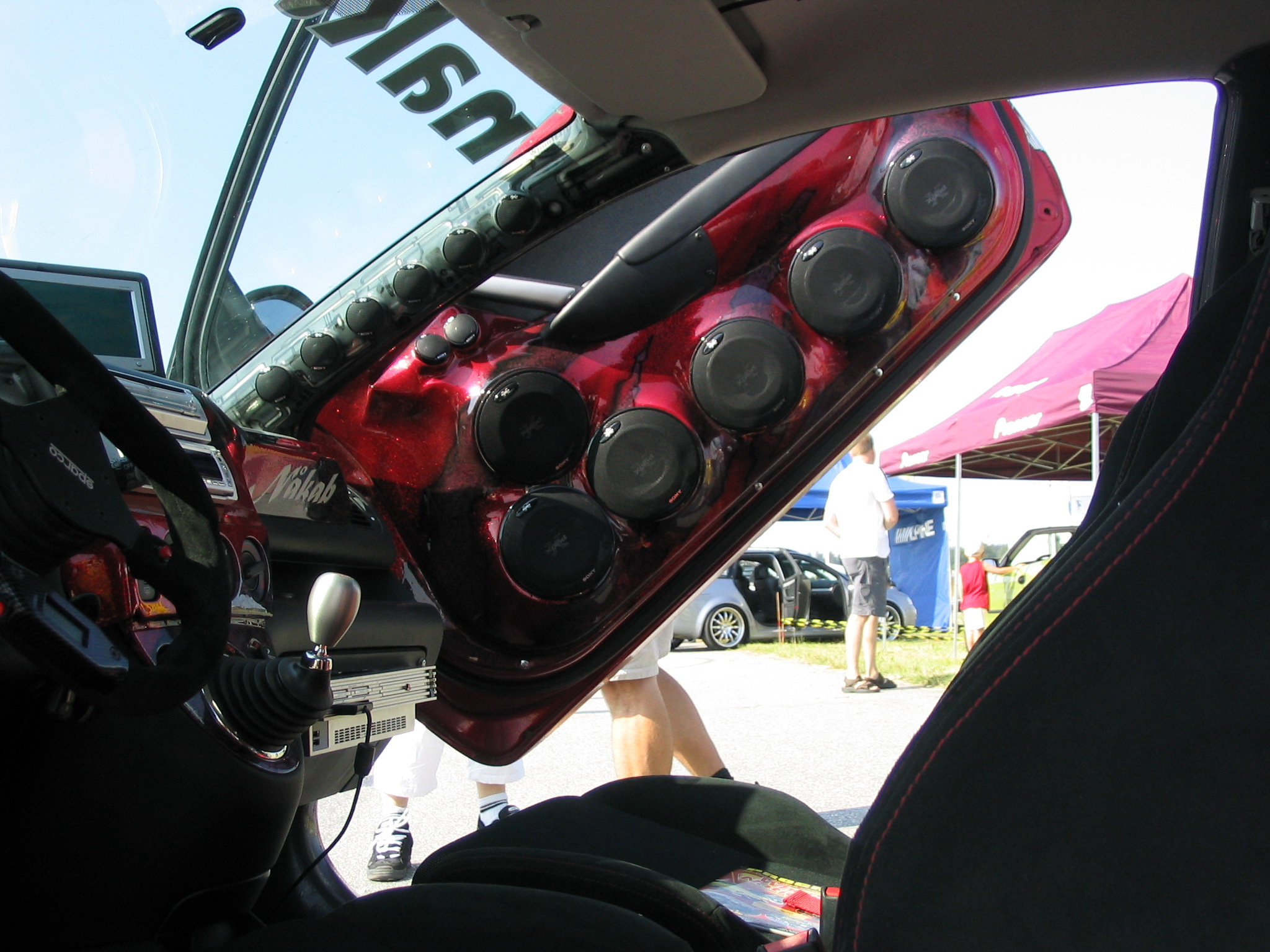 8.8.04. Sunnuntai-aamuna hyvissä ajoin herätys. Aamupalan kautta hotellin netin ääreen, josta tarkastelimme kuluneen viikonlopun Fascan kilpailun tuloksia (7.8.04). Masut täynnä suuntasimme kohti kilpailupaikkaa, joka sijaitsee noin puolen tunnin ajomatkan päässä Tukholmasta Barkarby:ssä. Aamulla hoidettiin pakolliset muodollisuudet eli kilpailukaavakkeiden täyttö ja maksu joka oli omalla kohdallani amatööri-luokassa 200 kruunua, pro-luokassa 600 kruunua. Auton kisapaikalle ajettuani aukaisin takakontin ja ovet. Sen jälkeen jäin odottelemaan tuomareita. Pari tuntia odoteltuani saapui paikalle kuuntelutuomari ? Kyllä luokassani oli vain yksi kuuntelutuomari. Hän hoiti kuuntelun alta pois ja autostani ei löytynyt oikein mitään sanottavaa, lukuunottamatta sub-taajuuden alinta oktaavia joka puuttui.(se oli tiedossa Suomessa kilpaillessani jo). Päivä kului auringossa istuskellessani(+30C) Puolen päivän jälkeen alkoi virrata paikalle moottoripyöriä, todella upeita ja hyvin rakennettuja jenkki-autoja, styling-autoja. Ainoastaan messu-tytsyt loistivat poissaolollaan (paha, paha).