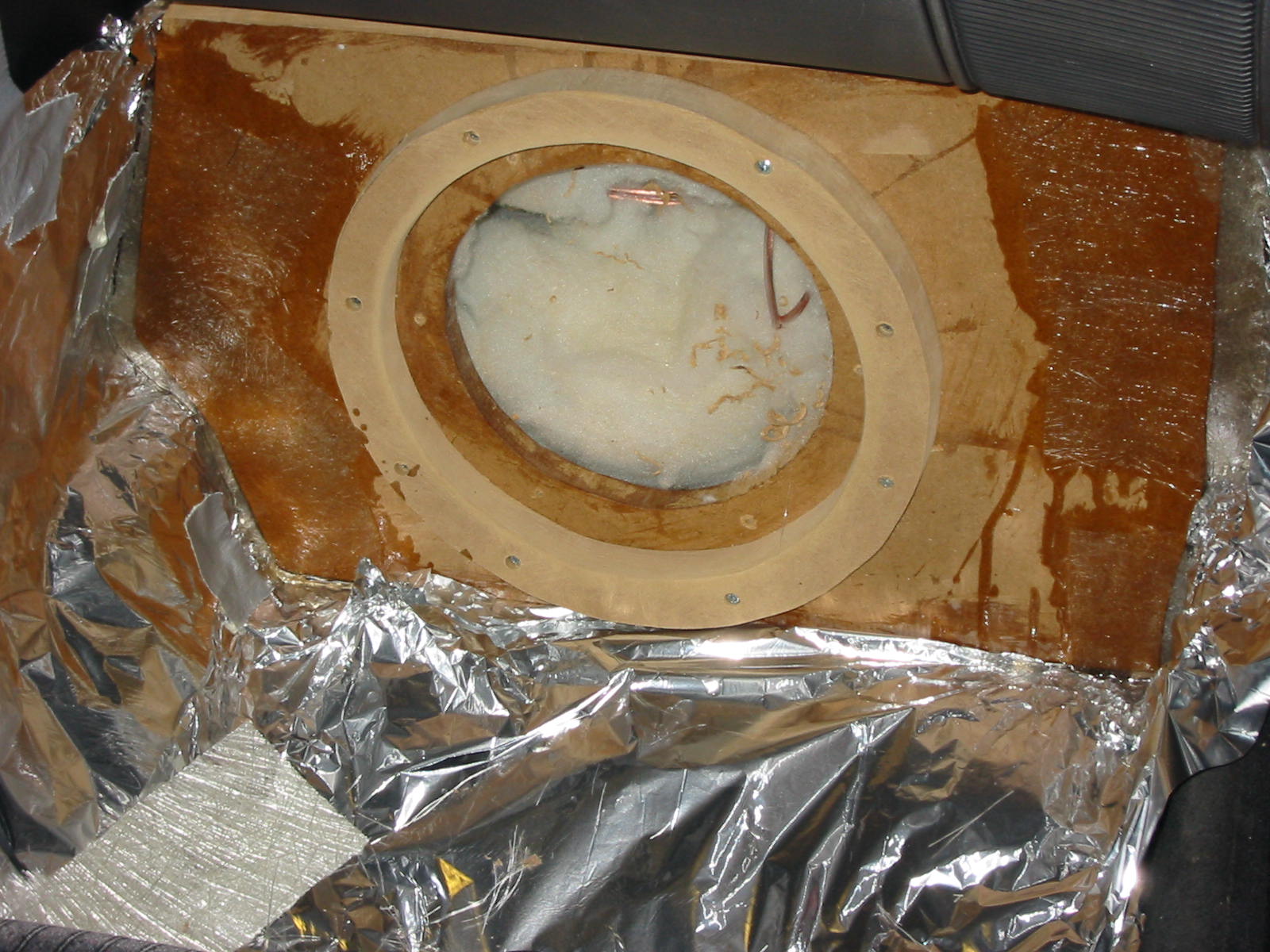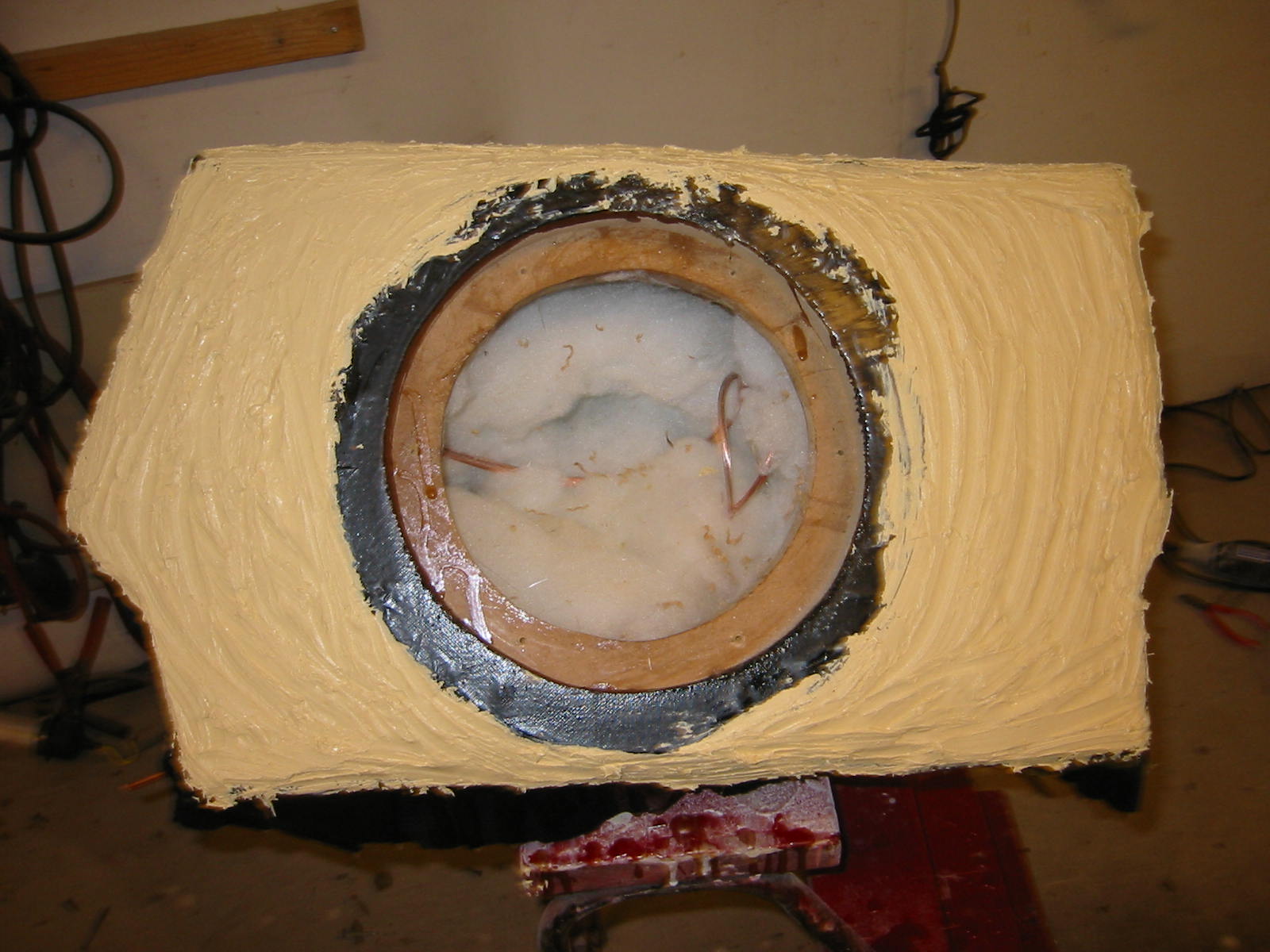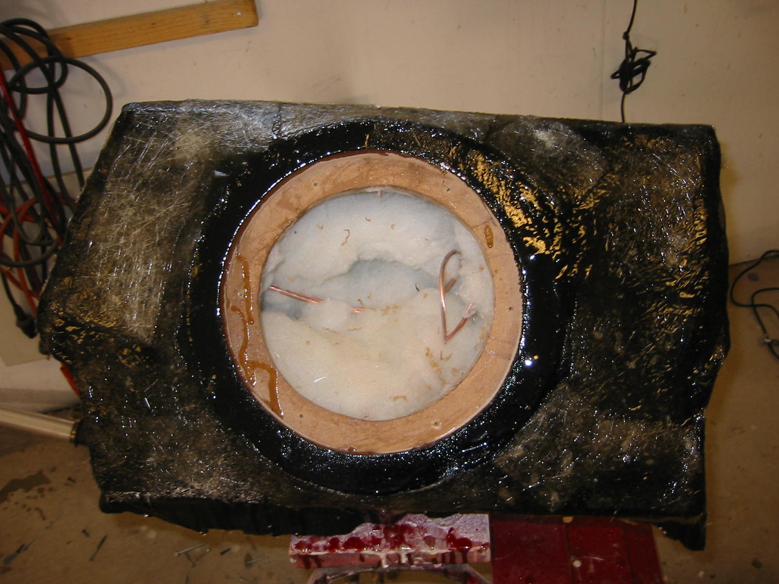 Siitä se alkoi... Ensiksi muotti jalkotilaan, viikko laminointia, seinämävahvuus noin 25mm, hartsia 10kg ja mattoa... riittävästi... sitten etulevyn sovittelu paikoilleen, elementin upotuskauluksineen