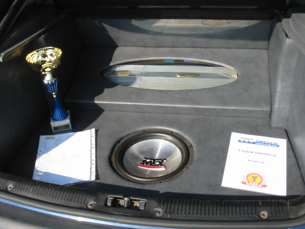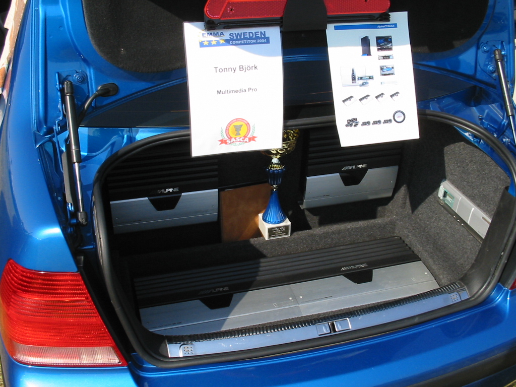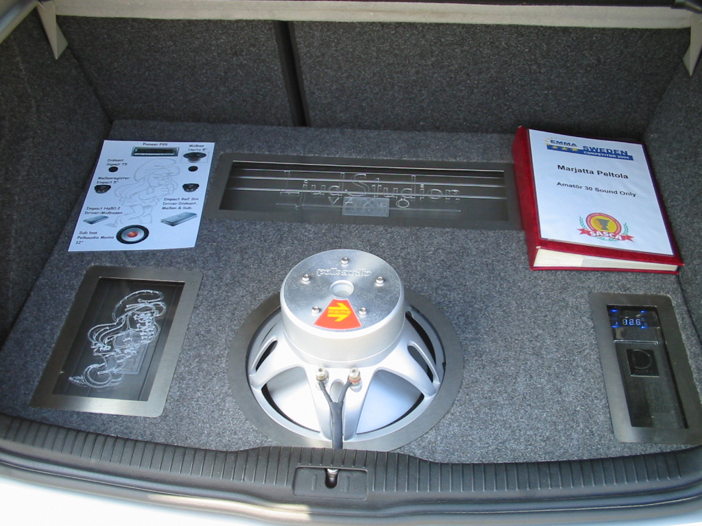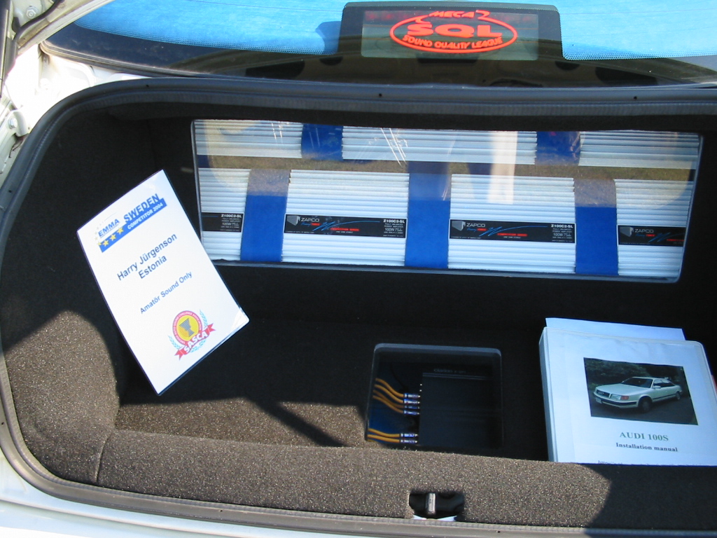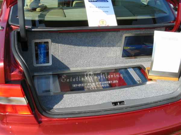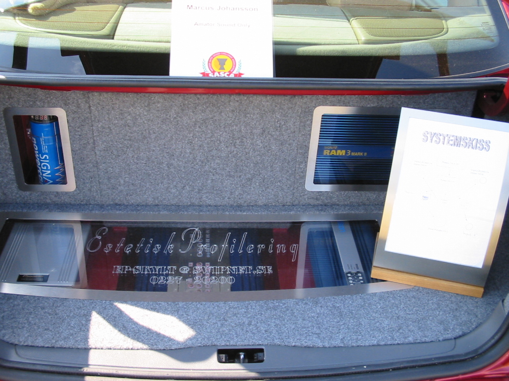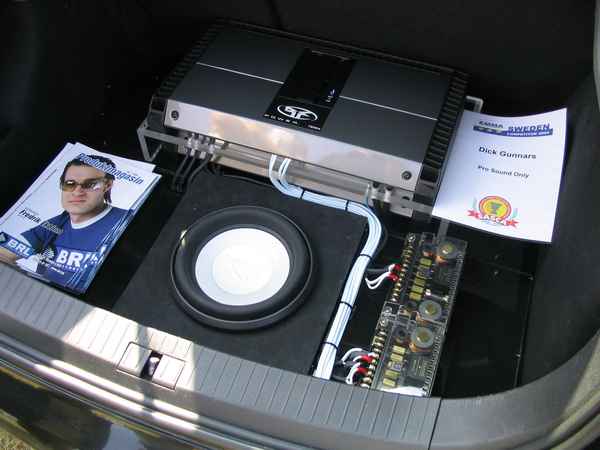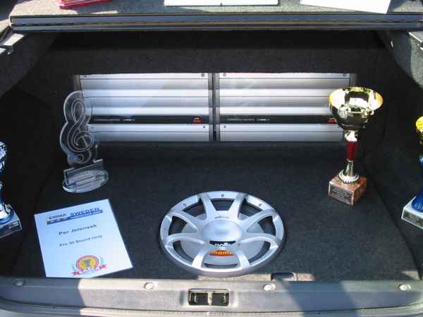 Asennuspuolellakaan ei ollut mitään ihmeellistä joten jäin odottelemaan tuloksia. Neljän jälkeen jaettiin kilpailuarvostelu-kaavakkeet takaisin joista oli laskettu pisteet valmiiksi, mutta sijoituksista ei ollut vielä tässä vaiheessa tietoa. Noin klo:17.00 alkoi palkintojen jako. Kilpailutuomaristo kutsui kerrallaan luokkansa kolme parasta tuomariston palkittaviksi pytyllä. Aloitettiin Rookien 15000 kruunua luokasta päätyen pro-luokkiin. Kun luokkani palkintojen jako tuli, olin yllättynyt kun nimeni huudettiin kolmen palkittavan joukkoon, Kolmas sija meni Ruotsiin ja sen jälkeen rupesin miettimään…? Kun toinen sija oli jaossa huudettiin nimeni, olin voittajan kanssa tasapisteissä, mutta koska pisteet olivat tasan, ruvettiin hakemaan ratkaisua kuuntelupisteistä, jossa olin kakkonen. Näin jälleen kerran voitto meni muualle , tällä kertaa Saksaan. (Tuumin mielessäni painokelvotonta tekstiä). Kävin kilpailun jälkeen katsomassa voittaja-autoa. Laitteistokokoonpano oli seuraavanlainen: diskantit kojelaudalla suunnattuna kohti kuuntelijaa, keskiäänet oven alalaidassa 6,5”, subit 2 kpl 8” jotka ovat sijoitettu takapenkin sivustoihin. Pitää näköjään miettiä tulevaa laitteistoa tuohon suuntaan, kerran tuollaisellakin pärjää…?