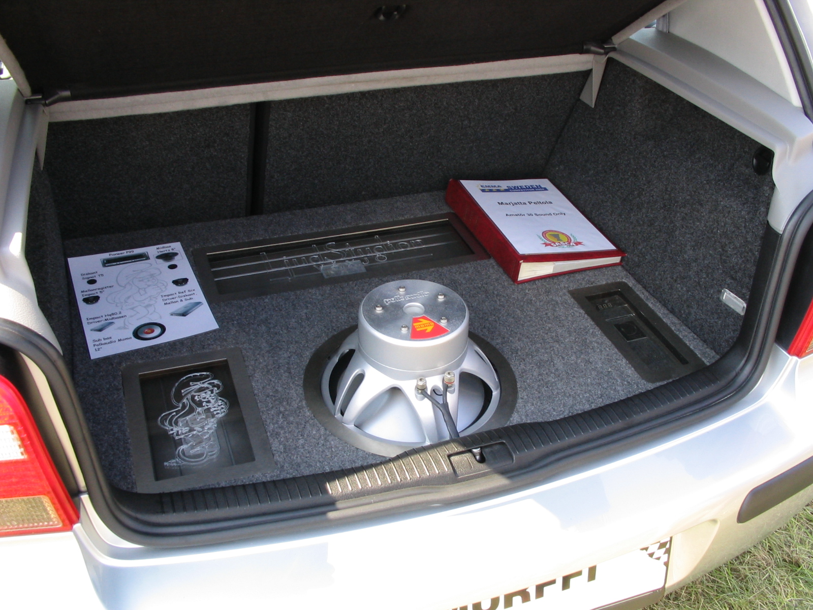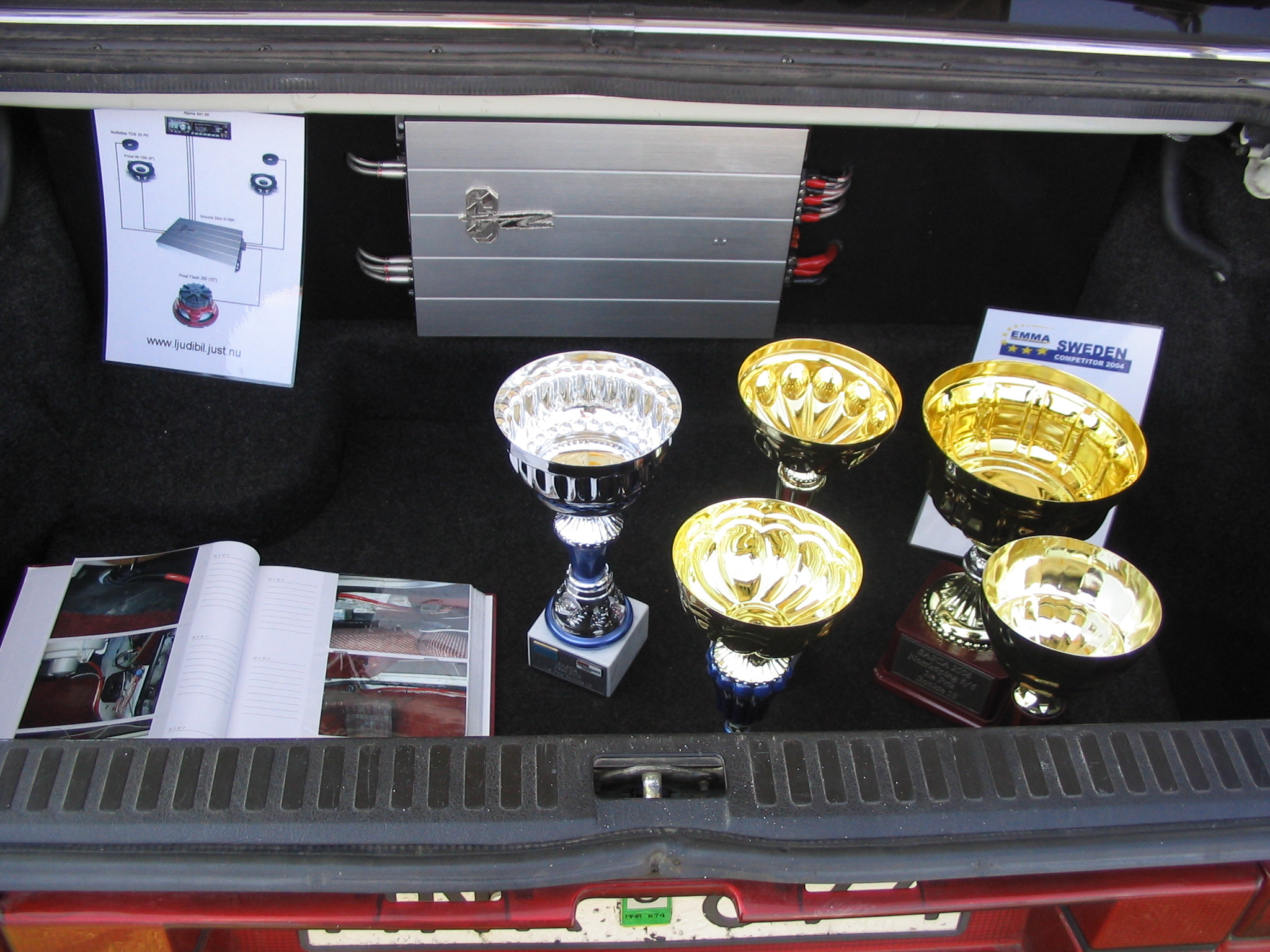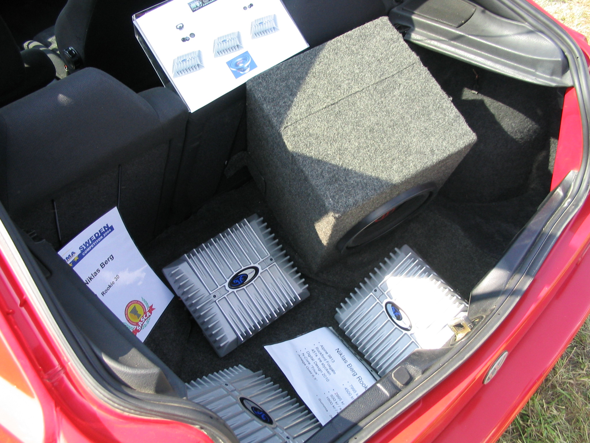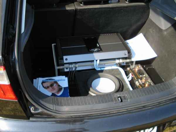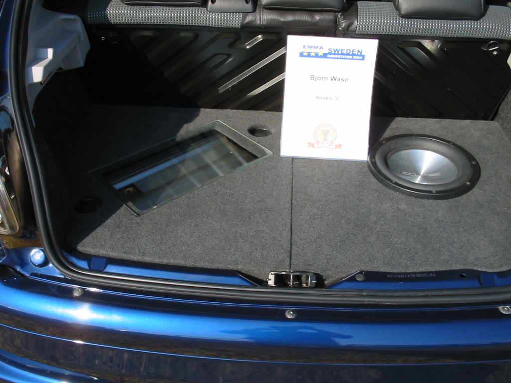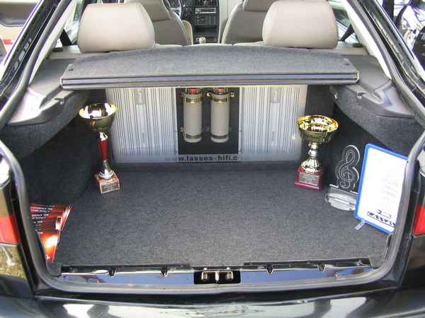 Asennuspuolellakaan ei ollut mitään ihmeellistä joten jäin odottelemaan tuloksia. Neljän jälkeen jaettiin kilpailuarvostelu-kaavakkeet takaisin joista oli laskettu pisteet valmiiksi, mutta sijoituksista ei ollut vielä tässä vaiheessa tietoa. Noin klo:17.00 alkoi palkintojen jako. Kilpailutuomaristo kutsui kerrallaan luokkansa kolme parasta tuomariston palkittaviksi pytyllä. Aloitettiin Rookien 15000 kruunua luokasta päätyen pro-luokkiin. Kun luokkani palkintojen jako tuli, olin yllättynyt kun nimeni huudettiin kolmen palkittavan joukkoon, Kolmas sija meni Ruotsiin ja sen jälkeen rupesin miettimään…? Kun toinen sija oli jaossa huudettiin nimeni, olin voittajan kanssa tasapisteissä, mutta koska pisteet olivat tasan, ruvettiin hakemaan ratkaisua kuuntelupisteistä, jossa olin kakkonen. Näin jälleen kerran voitto meni muualle , tällä kertaa Saksaan. (Tuumin mielessäni painokelvotonta tekstiä). Kävin kilpailun jälkeen katsomassa voittaja-autoa. Laitteistokokoonpano oli seuraavanlainen: diskantit kojelaudalla suunnattuna kohti kuuntelijaa, keskiäänet oven alalaidassa 6,5”, subit 2 kpl 8” jotka ovat sijoitettu takapenkin sivustoihin. Pitää näköjään miettiä tulevaa laitteistoa tuohon suuntaan, kerran tuollaisellakin pärjää…?