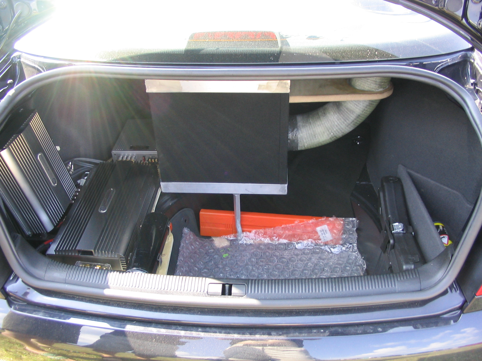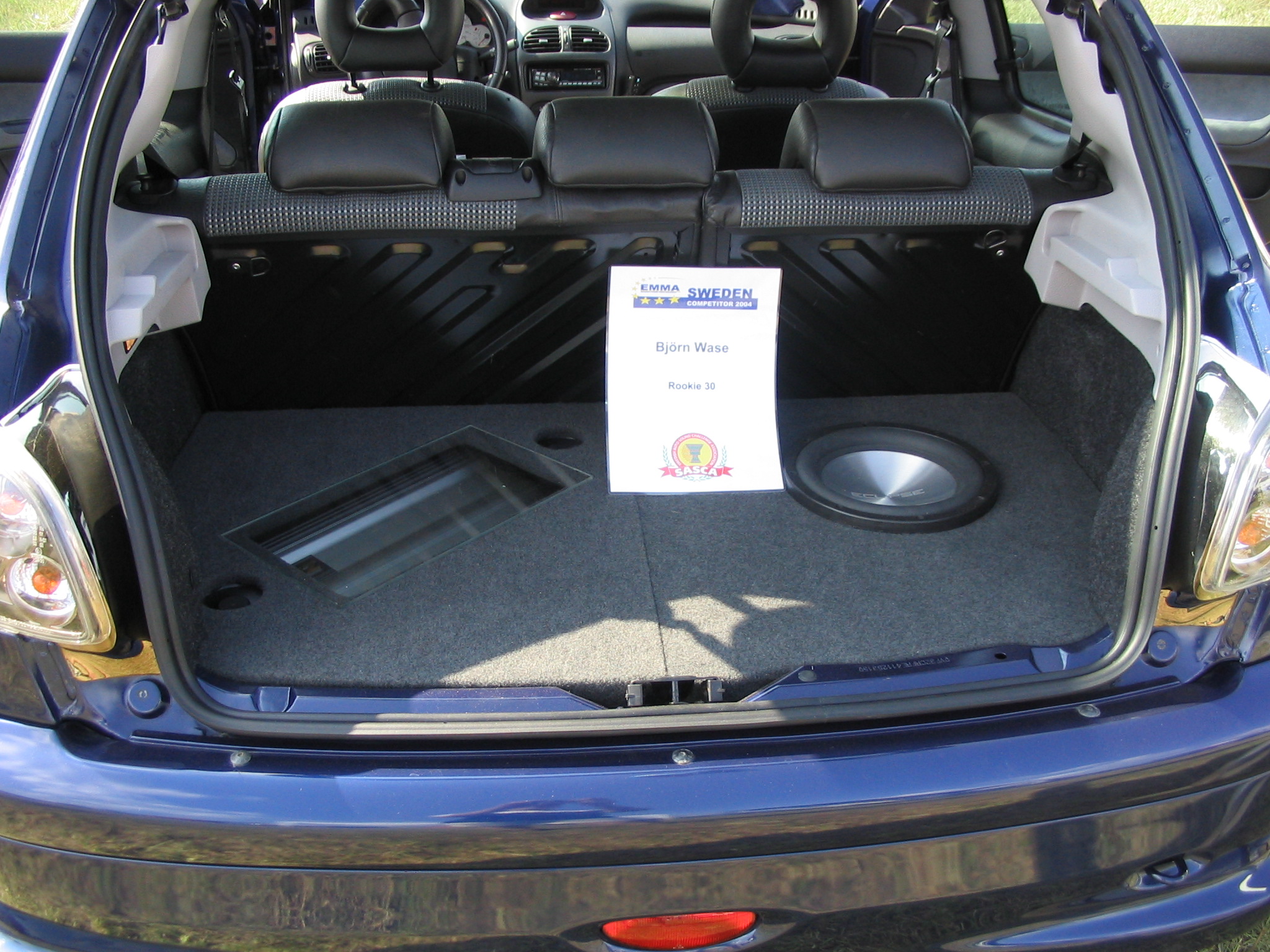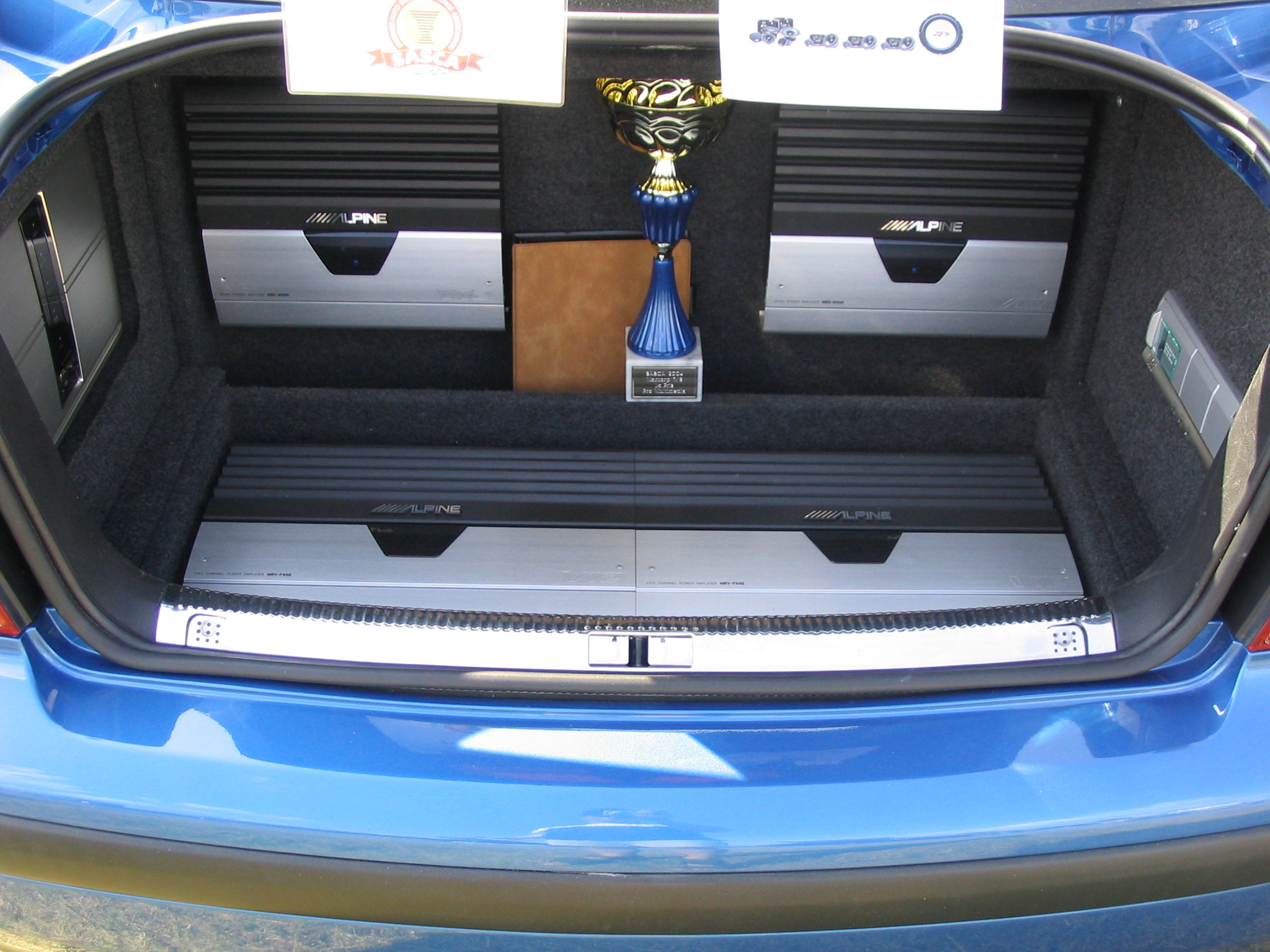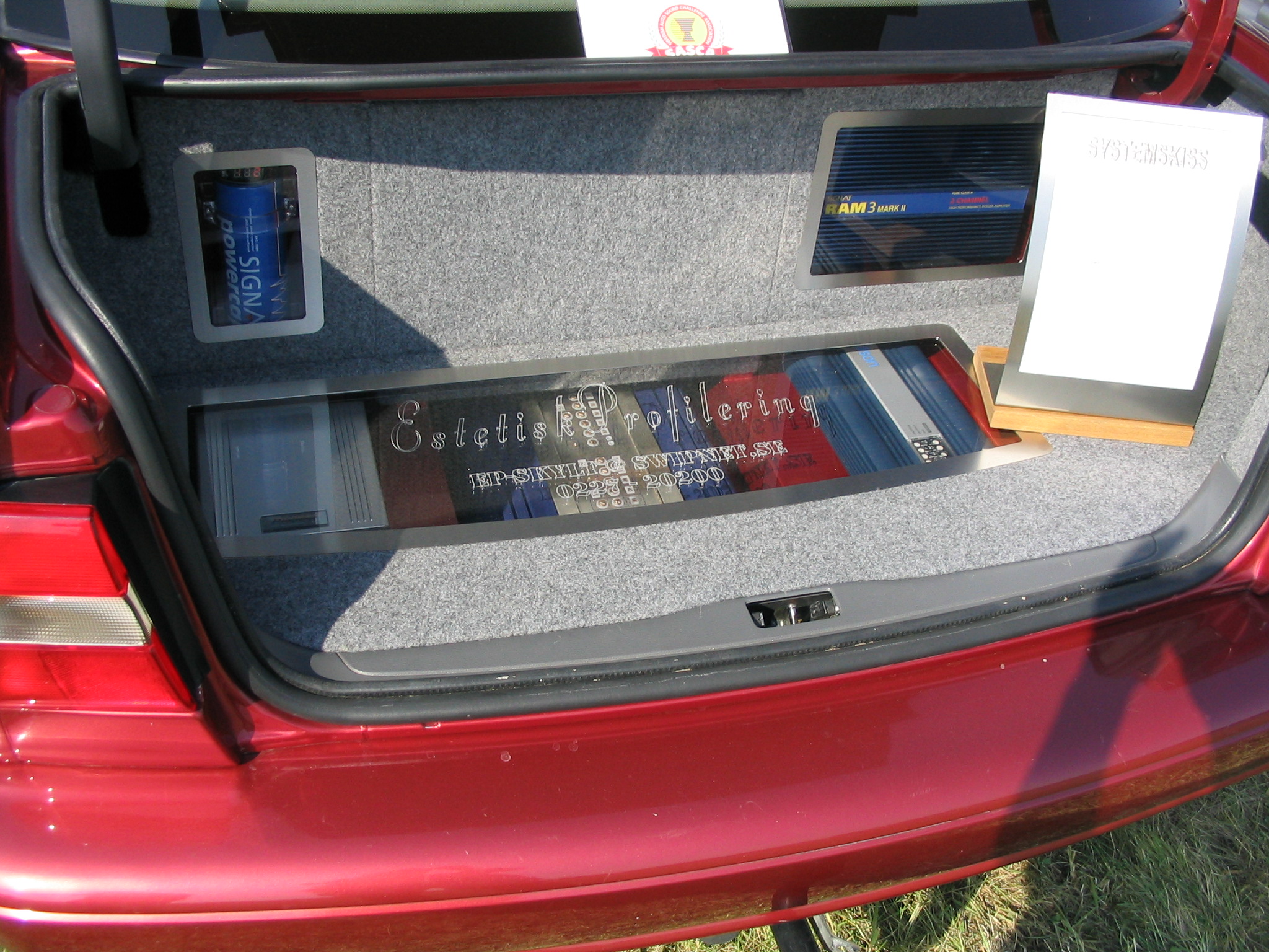 Asennuspuolellakaan ei ollut mitään ihmeellistä joten jäin odottelemaan tuloksia. Neljän jälkeen jaettiin kilpailuarvostelu-kaavakkeet takaisin joista oli laskettu pisteet valmiiksi, mutta sijoituksista ei ollut vielä tässä vaiheessa tietoa. Noin klo:17.00 alkoi palkintojen jako. Kilpailutuomaristo kutsui kerrallaan luokkansa kolme parasta tuomariston palkittaviksi pytyllä. Aloitettiin Rookien 15000 kruunua luokasta päätyen pro-luokkiin. Kun luokkani palkintojen jako tuli, olin yllättynyt kun nimeni huudettiin kolmen palkittavan joukkoon, Kolmas sija meni Ruotsiin ja sen jälkeen rupesin miettimään…? Kun toinen sija oli jaossa huudettiin nimeni, olin voittajan kanssa tasapisteissä, mutta koska pisteet olivat tasan, ruvettiin hakemaan ratkaisua kuuntelupisteistä, jossa olin kakkonen. Näin jälleen kerran voitto meni muualle , tällä kertaa Saksaan. (Tuumin mielessäni painokelvotonta tekstiä). Kävin kilpailun jälkeen katsomassa voittaja-autoa. Laitteistokokoonpano oli seuraavanlainen: diskantit kojelaudalla suunnattuna kohti kuuntelijaa, keskiäänet oven alalaidassa 6,5”, subit 2 kpl 8” jotka ovat sijoitettu takapenkin sivustoihin. Pitää näköjään miettiä tulevaa laitteistoa tuohon suuntaan, kerran tuollaisellakin pärjää…?