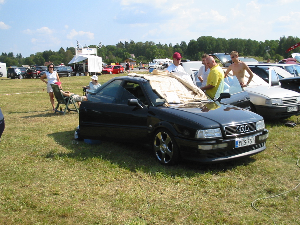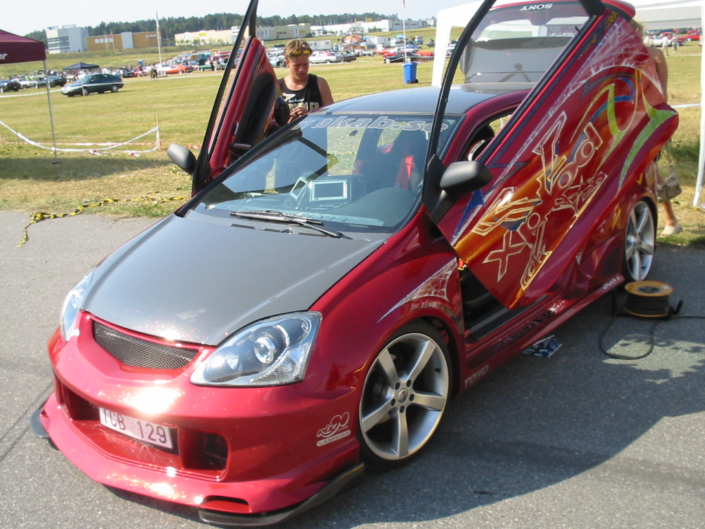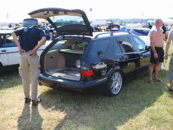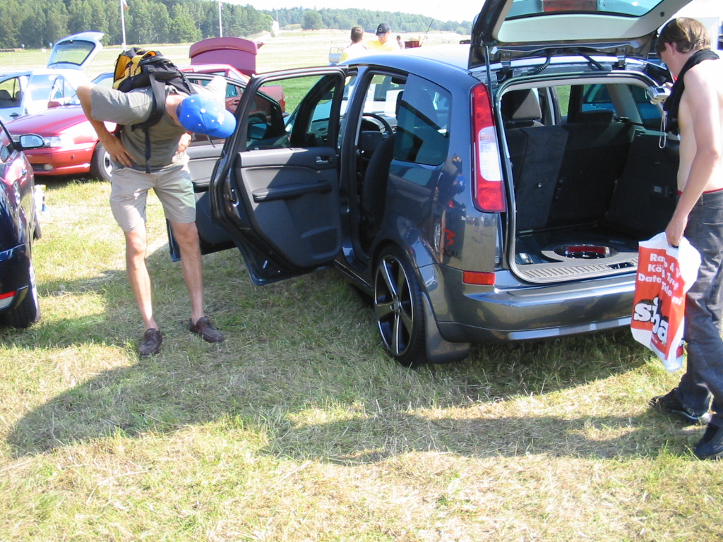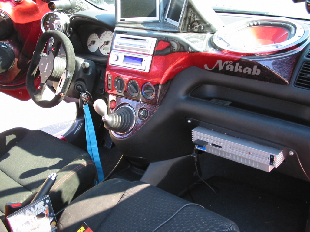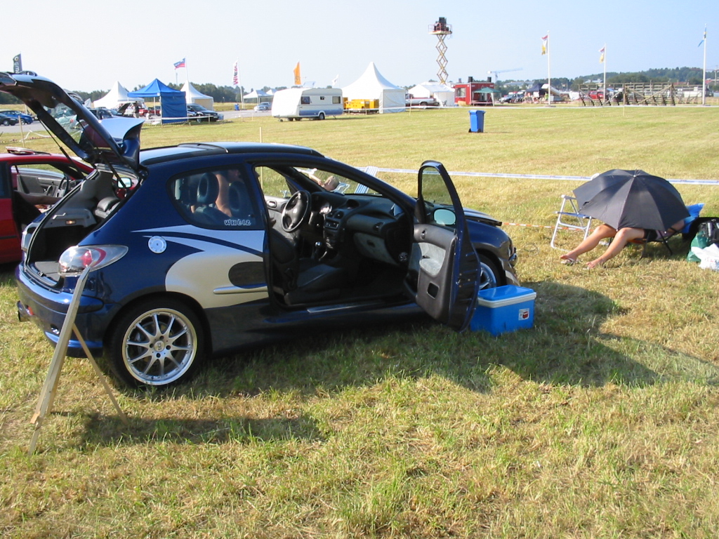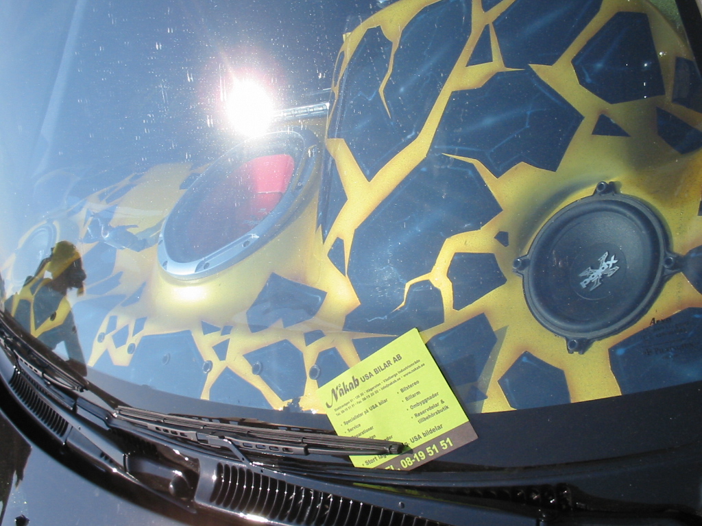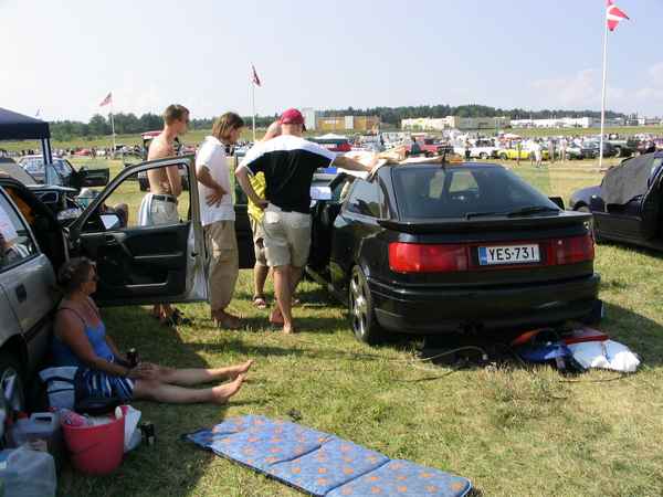 8.8.04. Sunnuntai-aamuna hyvissä ajoin herätys. Aamupalan kautta hotellin netin ääreen, josta tarkastelimme kuluneen viikonlopun Fascan kilpailun tuloksia (7.8.04). Masut täynnä suuntasimme kohti kilpailupaikkaa, joka sijaitsee noin puolen tunnin ajomatkan päässä Tukholmasta Barkarby:ssä. Aamulla hoidettiin pakolliset muodollisuudet eli kilpailukaavakkeiden täyttö ja maksu joka oli omalla kohdallani amatööri-luokassa 200 kruunua, pro-luokassa 600 kruunua. Auton kisapaikalle ajettuani aukaisin takakontin ja ovet. Sen jälkeen jäin odottelemaan tuomareita. Pari tuntia odoteltuani saapui paikalle kuuntelutuomari ? Kyllä luokassani oli vain yksi kuuntelutuomari. Hän hoiti kuuntelun alta pois ja autostani ei löytynyt oikein mitään sanottavaa, lukuunottamatta sub-taajuuden alinta oktaavia joka puuttui.(se oli tiedossa Suomessa kilpaillessani jo). Päivä kului auringossa istuskellessani(+30C) Puolen päivän jälkeen alkoi virrata paikalle moottoripyöriä, todella upeita ja hyvin rakennettuja jenkki-autoja, styling-autoja. Ainoastaan messu-tytsyt loistivat poissaolollaan (paha, paha).