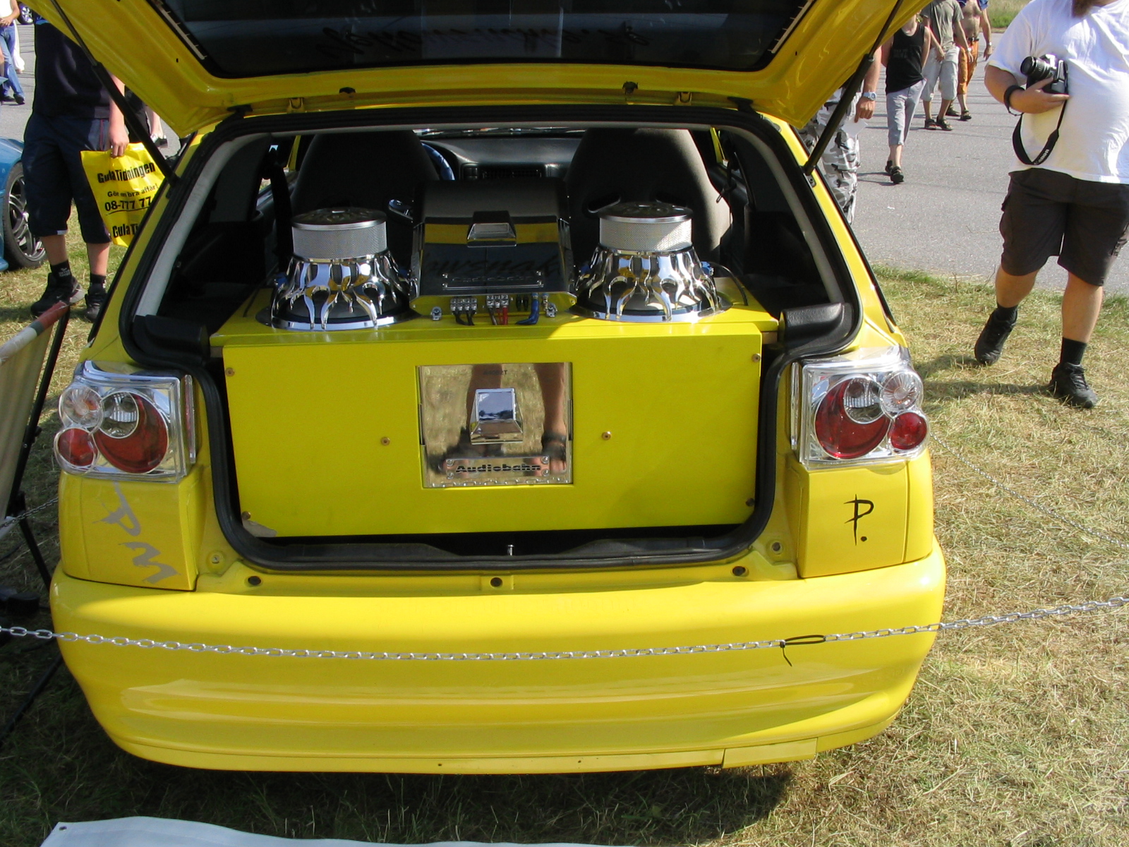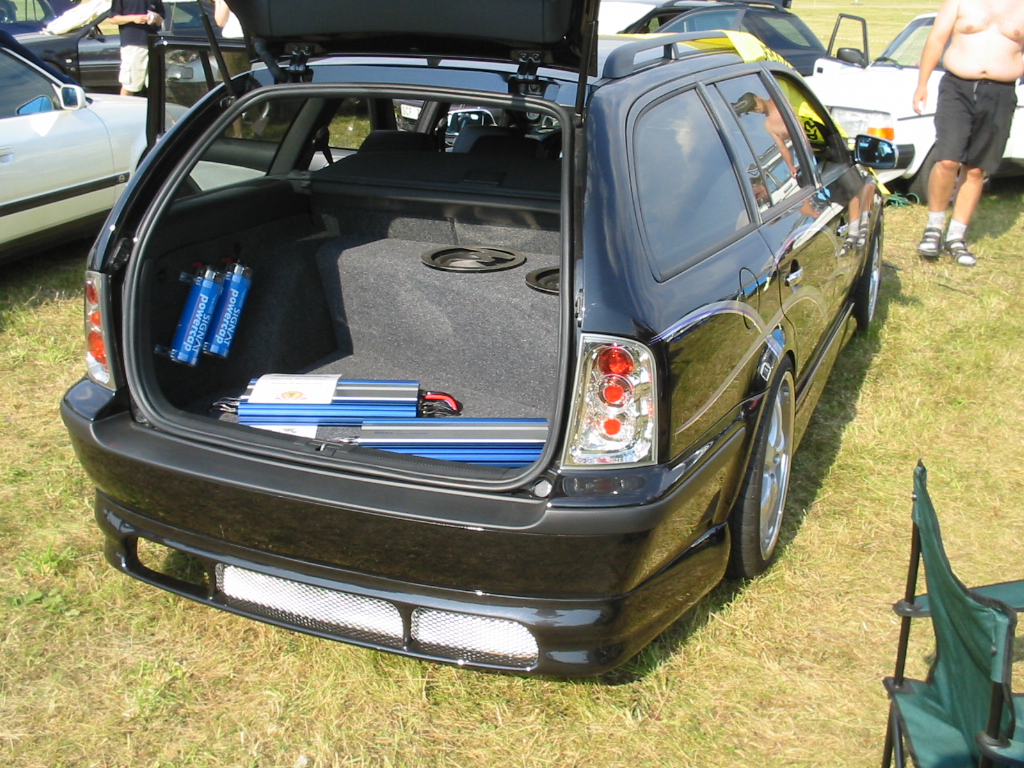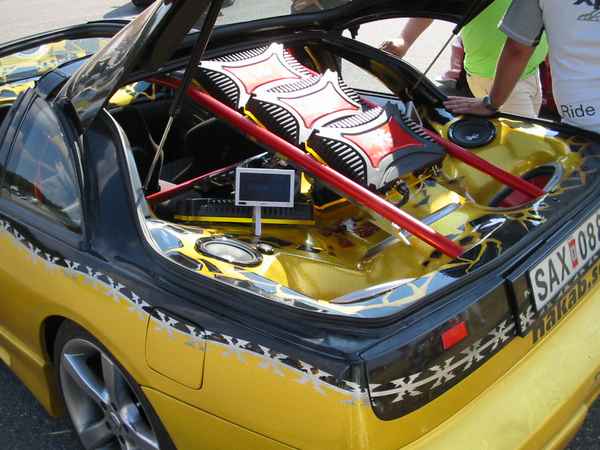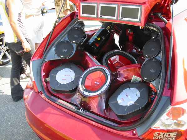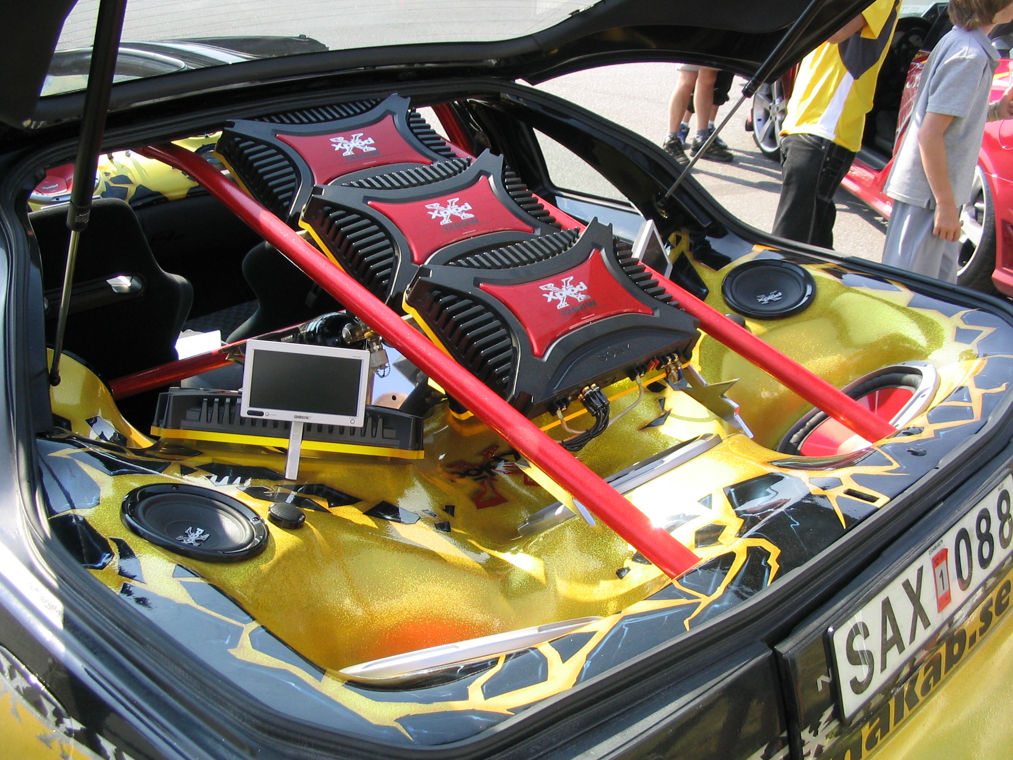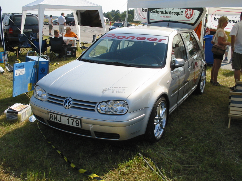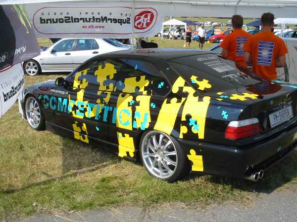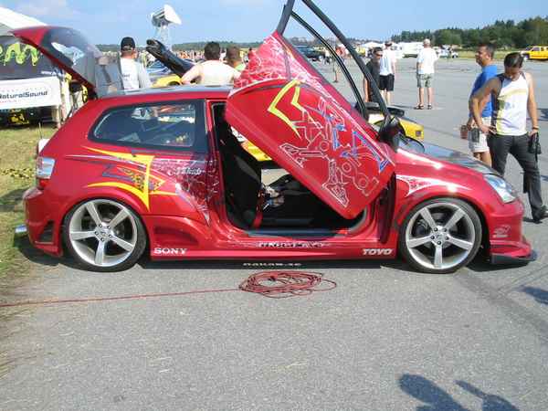 8.8.04. Sunnuntai-aamuna hyvissä ajoin herätys. Aamupalan kautta hotellin netin ääreen, josta tarkastelimme kuluneen viikonlopun Fascan kilpailun tuloksia (7.8.04). Masut täynnä suuntasimme kohti kilpailupaikkaa, joka sijaitsee noin puolen tunnin ajomatkan päässä Tukholmasta Barkarby:ssä. Aamulla hoidettiin pakolliset muodollisuudet eli kilpailukaavakkeiden täyttö ja maksu joka oli omalla kohdallani amatööri-luokassa 200 kruunua, pro-luokassa 600 kruunua. Auton kisapaikalle ajettuani aukaisin takakontin ja ovet. Sen jälkeen jäin odottelemaan tuomareita. Pari tuntia odoteltuani saapui paikalle kuuntelutuomari ? Kyllä luokassani oli vain yksi kuuntelutuomari. Hän hoiti kuuntelun alta pois ja autostani ei löytynyt oikein mitään sanottavaa, lukuunottamatta sub-taajuuden alinta oktaavia joka puuttui.(se oli tiedossa Suomessa kilpaillessani jo). Päivä kului auringossa istuskellessani(+30C) Puolen päivän jälkeen alkoi virrata paikalle moottoripyöriä, todella upeita ja hyvin rakennettuja jenkki-autoja, styling-autoja. Ainoastaan messu-tytsyt loistivat poissaolollaan (paha, paha).