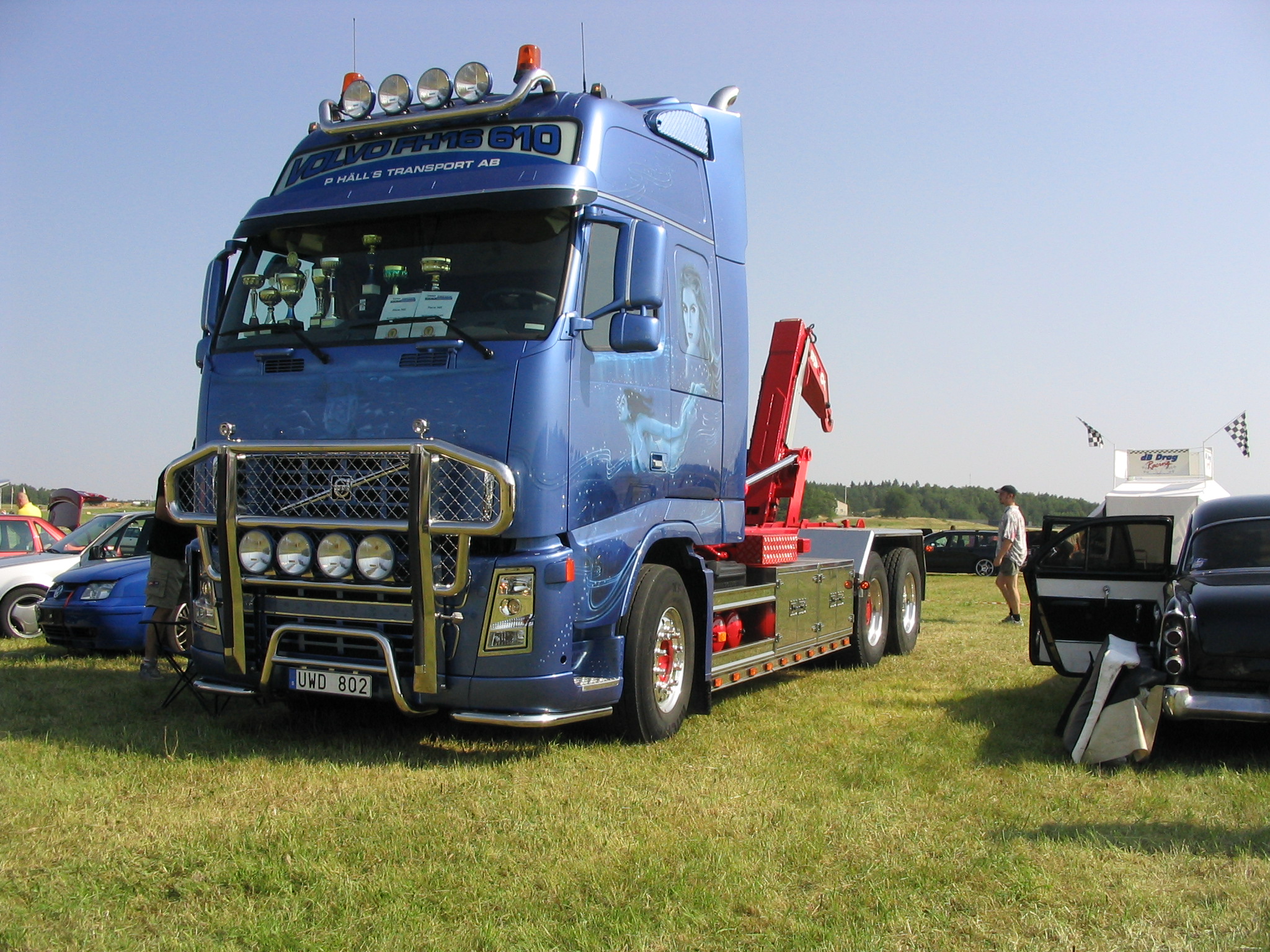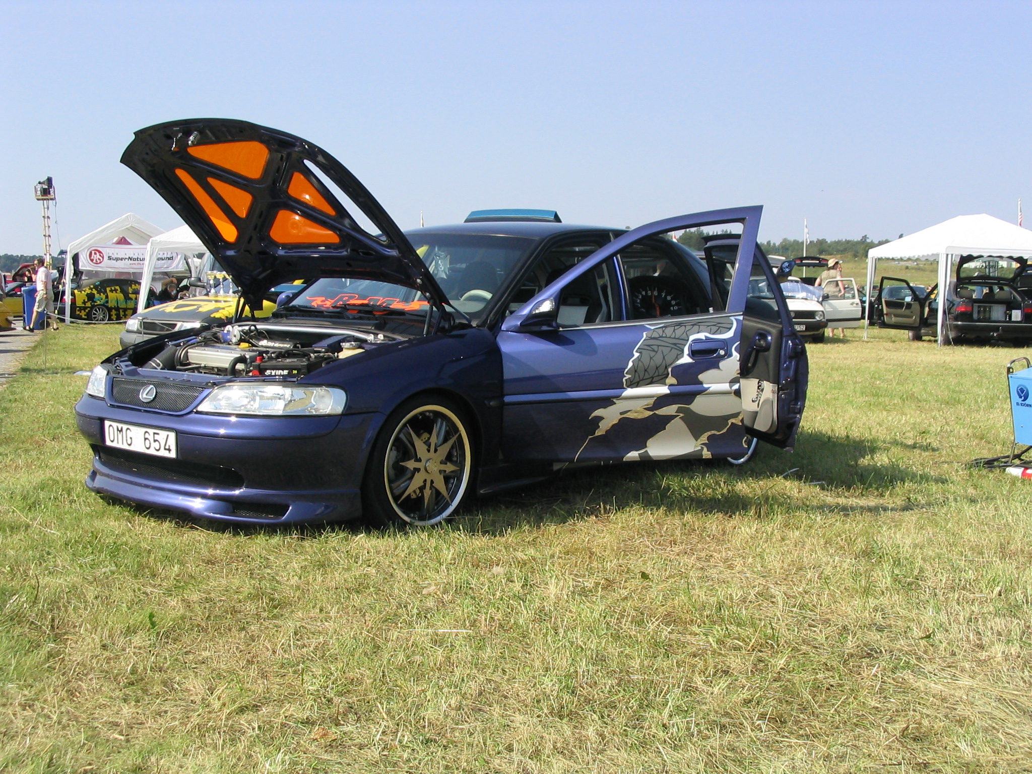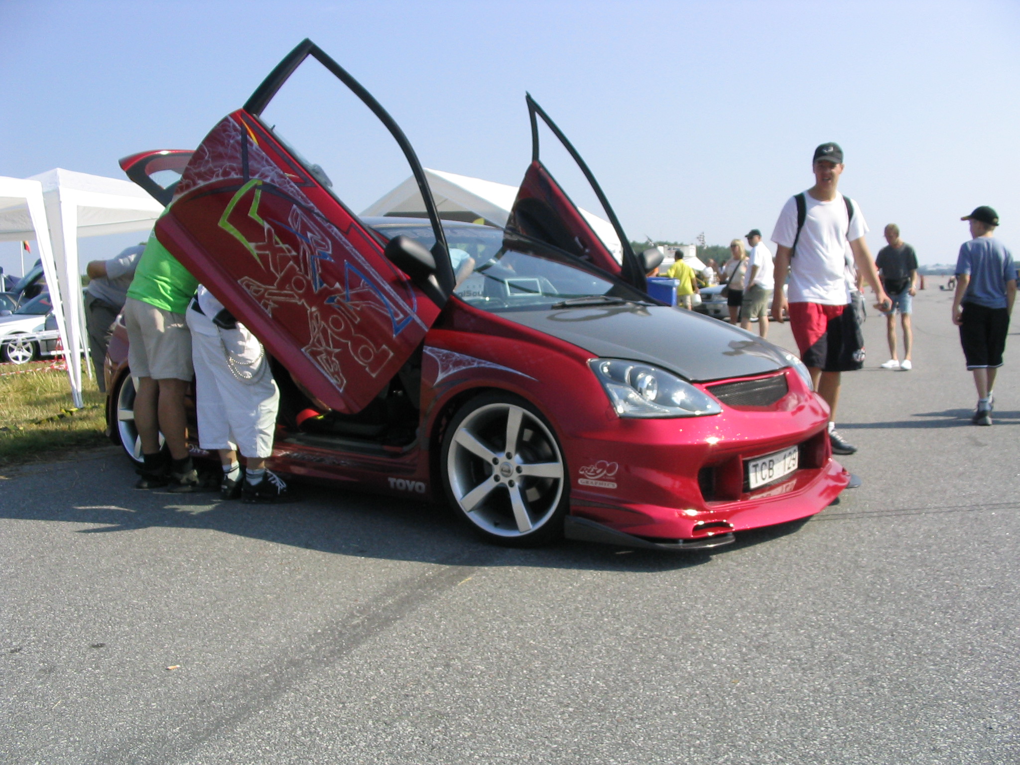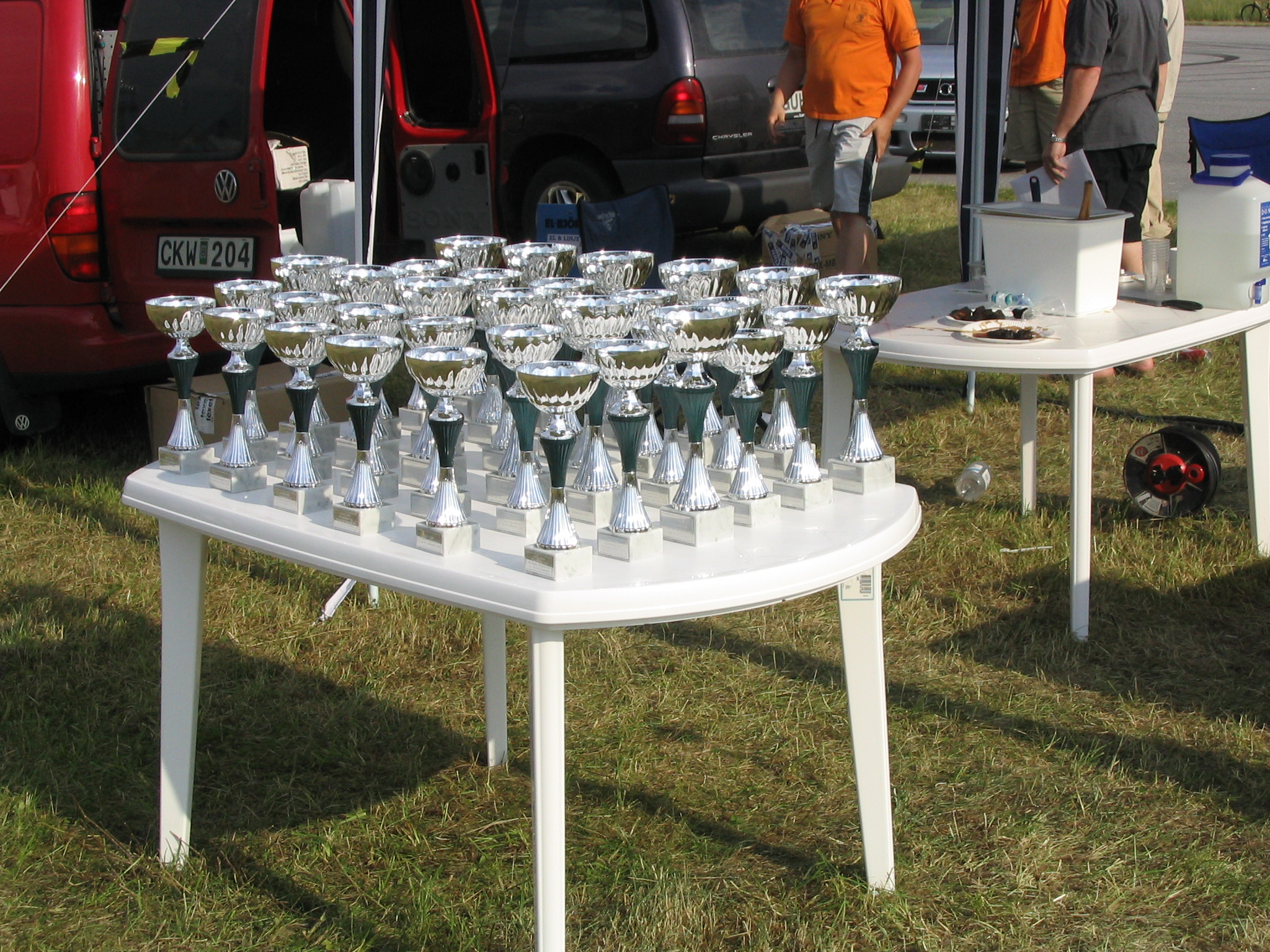 8.8.04. Sunnuntai-aamuna hyvissä ajoin herätys. Aamupalan kautta hotellin netin ääreen, josta tarkastelimme kuluneen viikonlopun Fascan kilpailun tuloksia (7.8.04). Masut täynnä suuntasimme kohti kilpailupaikkaa, joka sijaitsee noin puolen tunnin ajomatkan päässä Tukholmasta Barkarby:ssä. Aamulla hoidettiin pakolliset muodollisuudet eli kilpailukaavakkeiden täyttö ja maksu joka oli omalla kohdallani amatööri-luokassa 200 kruunua, pro-luokassa 600 kruunua. Auton kisapaikalle ajettuani aukaisin takakontin ja ovet. Sen jälkeen jäin odottelemaan tuomareita. Pari tuntia odoteltuani saapui paikalle kuuntelutuomari ? Kyllä luokassani oli vain yksi kuuntelutuomari. Hän hoiti kuuntelun alta pois ja autostani ei löytynyt oikein mitään sanottavaa, lukuunottamatta sub-taajuuden alinta oktaavia joka puuttui.(se oli tiedossa Suomessa kilpaillessani jo). Päivä kului auringossa istuskellessani(+30C) Puolen päivän jälkeen alkoi virrata paikalle moottoripyöriä, todella upeita ja hyvin rakennettuja jenkki-autoja, styling-autoja. Ainoastaan messu-tytsyt loistivat poissaolollaan (paha, paha).